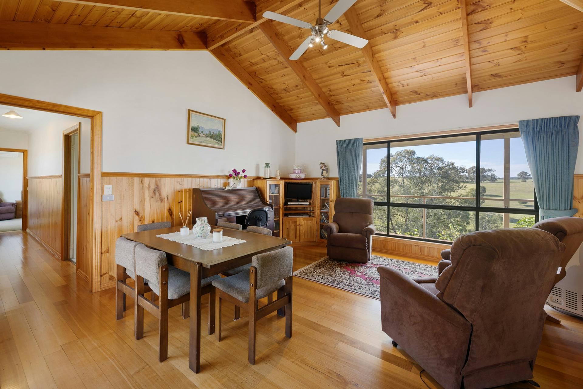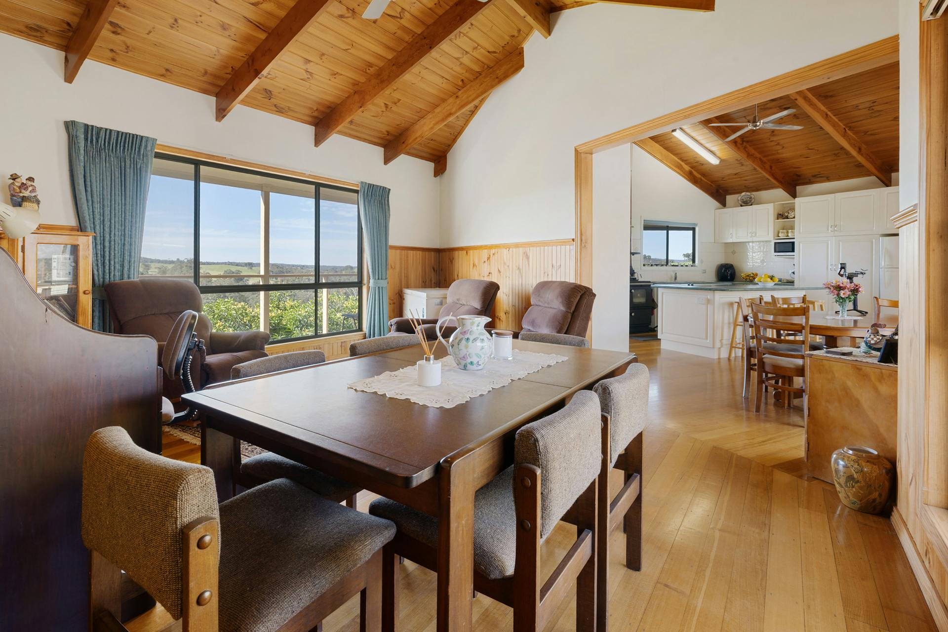 Constructed with a weathertex exterior, colourbond roofing, teated pine framing, hardwood floors and cathedral ceilings, the home blends durability with warmth. Large aluminium sliding windows draw the outdoor views inside, creating a sense of living among the landscpe. Inside, comfort meets country charm with quality carpets and window furnishings, wood-fuel heating, a combustion stove with hot water jacket, electric cooktop and hot water service, dishwasher, two split system air-conditioners, and ceiling fans in each room.